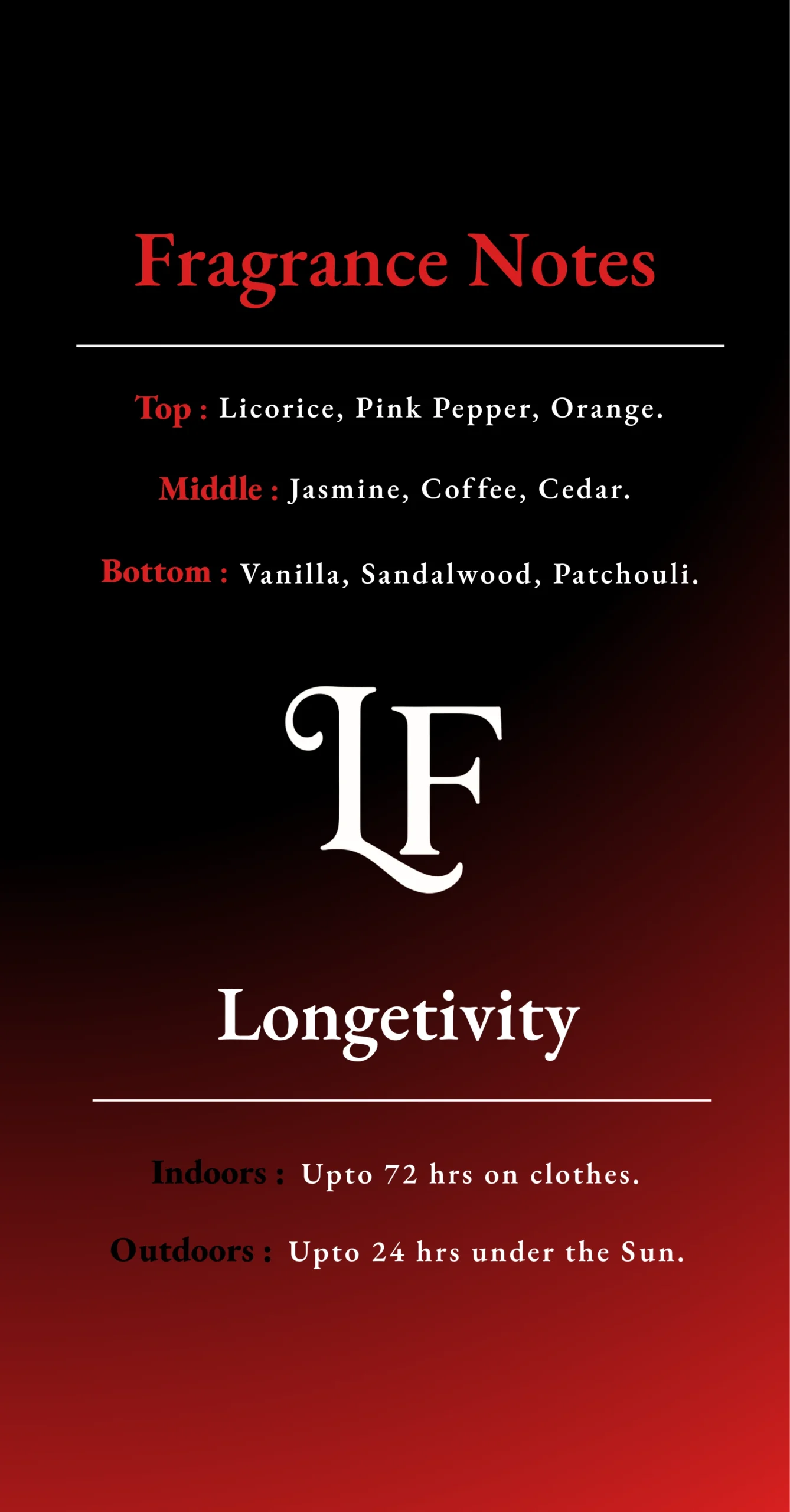 The fragrance opens with a striking blend of sweet licorice and vibrant orange, elevated by the subtle spice of pink pepper. The first impression is bold, slightly sweet, and intriguingly fresh.